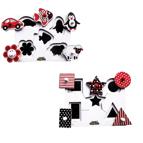 As a baby’s eyes are developing and learning to focus on the world around them, simple black and white patterns are much easier for them to see. These high-contrast Black and White Peg Puzzles will captivate their attention, encouraging visual development, as well as fine motor skills. Each puzzle contains 5 pieces, each with a corresponding silhouette underneath.
