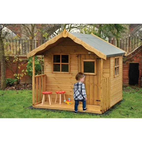 This larger children’s den playhouse can be used by several children at once and has endless role play opportunities to occupy and develop young minds. Solid redwood construction with 3 Georgian style windows and antique door handles and hinges