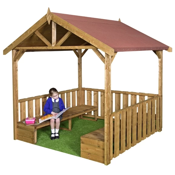 - This sturdy free standing kids gazebo and seating is an inviting area for your children, protected from the sun and rain, but has an open air space with partial shade.