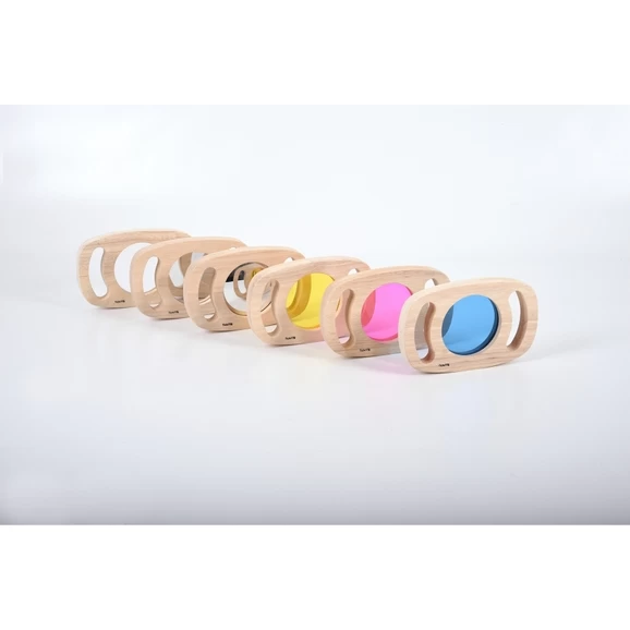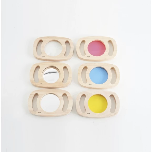 A 6 piece set allowing children to see the world through new eyes. The solid rubberwood frames enclose lenses to change the colour of everything they see, a giant magnifier and mirrors to give true and distorted reflections of the world around them. Can be stacked for colour mixing and for use on a light box.