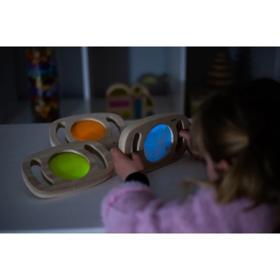 New to our best-selling Easy Hold range, these beautiful rubberwood frames with easy grip handles contain fascinating glow in the dark panels. Activated by leaving in bright light, when taken into a dark den they magically glow in vibrant colours – blue, green and orange. Children will love to watch the glowing liquid swirl and flow as they twist and turn the panels. 15 minutes of sunlight will activate the panels to glow for approx. 6 hours.