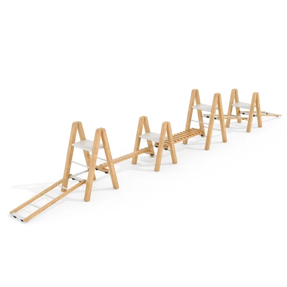 - Set includes 9 pieces – 4 trestles (2 high/2 low), 2 step ladders, 1 rope ladder, 1 narrow and 1 wide walk board