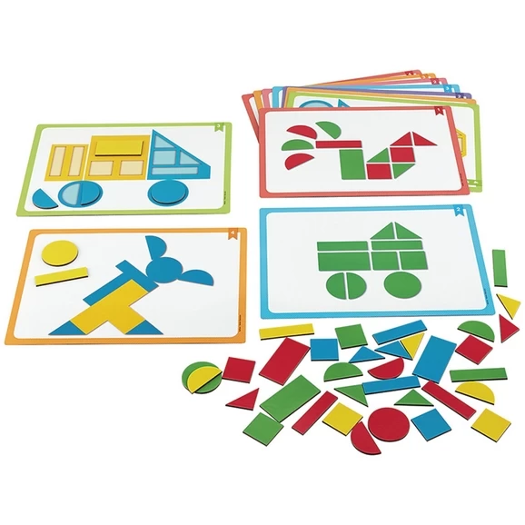 A colourful game where children use basic shapes to create recognisable object. Children copy the patterns on the cards using the shaped magnetic tiles. The 12 double sided activity cards are grouped into 6 levels of difficulty. Helps to develop: