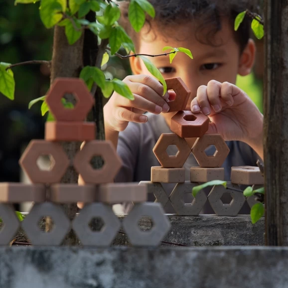 Increase the authenticity of your child’s open-ended building experience with these weighted Little Pavers – 60 pc. set. Children 3 and up will incorporate these hexagonal miniature pavers into unique architectural builds. The matte surface texture supports indoor and outdoor play and can withstand play that incorporates water, dirt, sand and mud. Natural, loose parts not included.