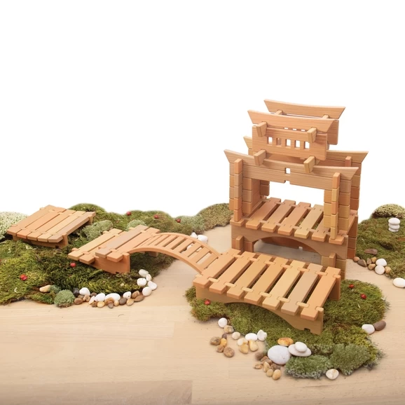 Children 3 and up can build using the Tabletop Notch Blocks – Eastern 87 piece set indoors or outdoors. Solid plastic, neutral-coloured blocks feature notched parts that easily connect for strong, detailed builds. Using included ladders and bridge pieces, children can build different structures with varying elevated platforms and span natural elements.