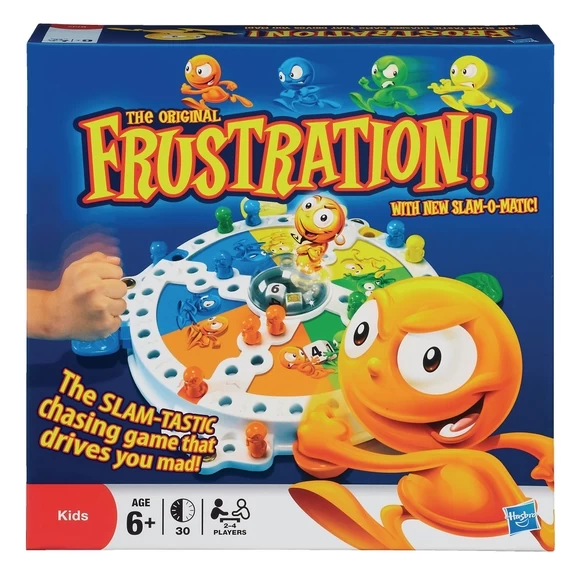 The SLAM-TASTIC chasing game that drives you mad! Each of your pegs has to go all the way around the board to the Finish space, but watch out – if another player’s peg lands on the same space as yours, your peg has to start over. The player who gets all 4 pegs into the Finish space wins!