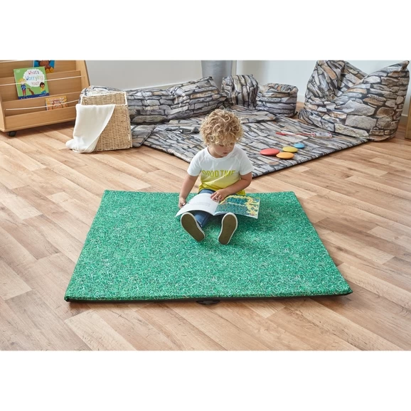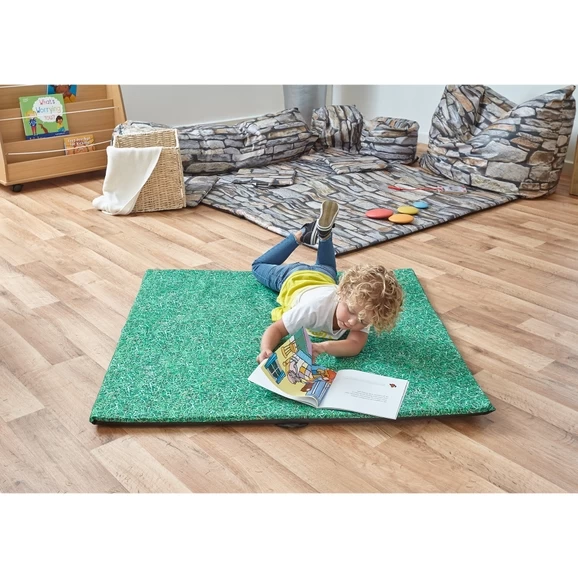 Indoor/outdoor wipe clean padded mats with non split seams and durable vinyl base. Complete with carry handles. 1 x 1100mm square x 25mm thick mat. Material Specification: Removable printed, fire retardant, waterproof polyester covers (urine resistant, latex and phthalate free ). Filling: CMHR CFC free furniture grade foam pad. Safety Notes: Wipe clean. Covers not machine washable. Grass. Age suitabilty:18 months +