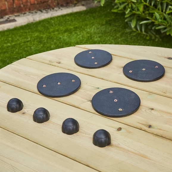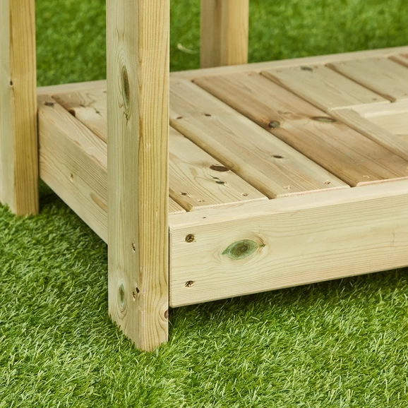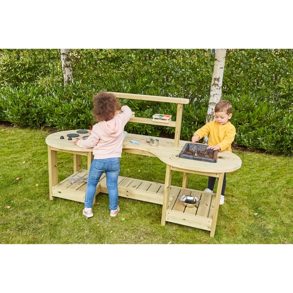 Get busy mixing, blending and creating concoctions at this robust Island Kitchen. This beautiful kitchen is accessible from all sides for a group of children to play around. Featuring a plastic washing bowl and play cooker, alongside a useful set of hooks and shelf for storage giving plenty of space to store all of your messy play containers, ingredients and utensils that add to the excitement and versatility of this fantastic open-ended resource. Made from sustainably sourced timber, treated against rot and is suitable to be left outdoors. Delivered fully assembled.