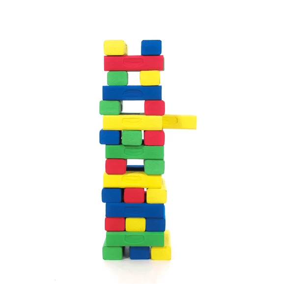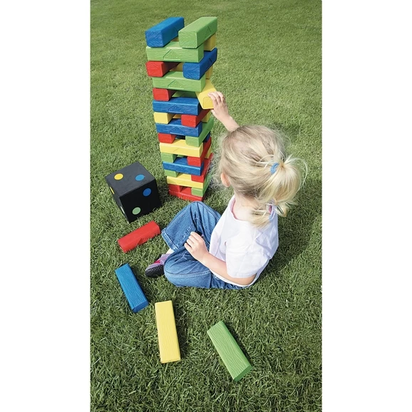 A massive coloured tower with a giant dice. A game of skill and tactics, throw the giant dice and it gives you a choice of 2 colours, choose 1 and remove a brick of that colour from the tower. Get it right and the tower stays tall, get it wrong and the tower will fall!