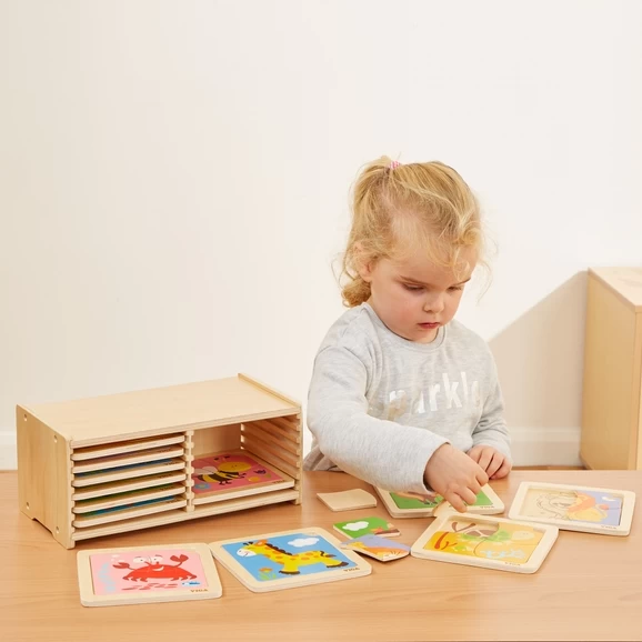 This set of puzzles comes complete with a space saving storage solution that help to keep everything neat and tidy. The bright colours and large chunky pieces make them perfect for little ones. The colourful illustrations allow children to relate these to their own experiences and promotes discussion.