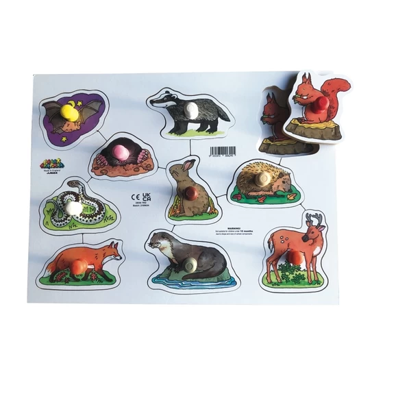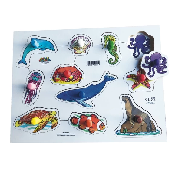 A set of wooden peg puzzles, each with a different theme – Wildlife, Pets, Insects and Marine Life