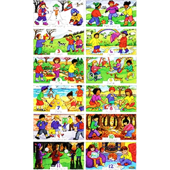 A wonderfully illustrated jigsaw showing the 12 months of the year. Each illustration depicts children’s activities relating to the seasons, the weather and tradition.