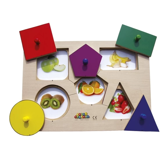 This wooden board has 5 colourful geometric shapes, under which hide a photographic image. The real life imagery allows children to relate these to the real world and promotes discussion.