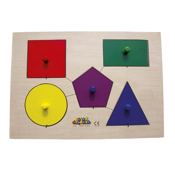 - Set includes 5 shapes with corresponding matching colour pegs for easy lifting