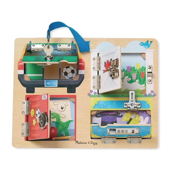 This wooden activity board challenges children to figure out how to unlock the different latches and locks. Children will enjoy discovering what’s hiding behind each of the panels.