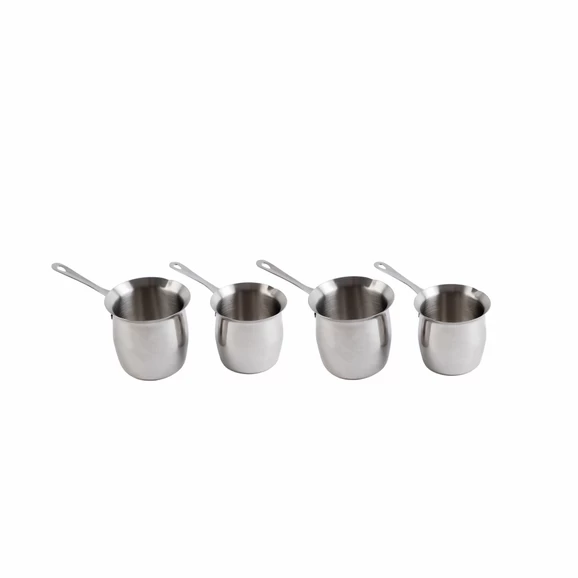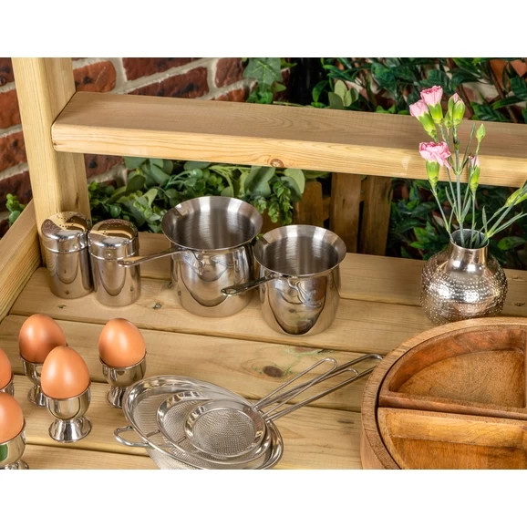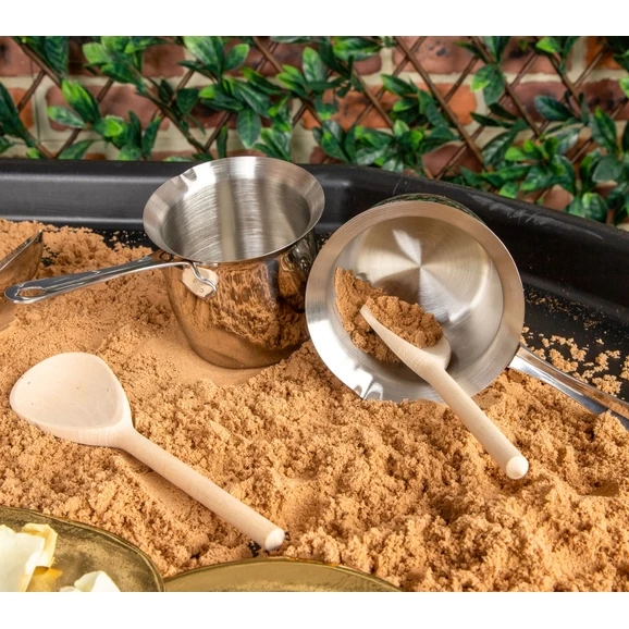 These Milk Pans can be used in forest schools or as role play items in the mud kitchen. They are also great for scooping sand and water, and feature a spout for pouring. Made from stainless steel, they are easy to clean. Set includes two large pans and two small pans.
