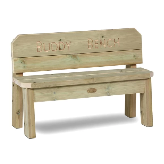 This charming buddy bench with engraved detail, is the ideal addition to any outdoor play area. A fantastic way to nurture communication and friendship. Dimensions – L900mm x W420mm x H630mm Seat Height: 350mm. Made using premium quality Scandinavian Redwood, specially treated and guaranteed for 10 years. Smooth finish – soft to touch and no splinters. Manufactured in the UK. Delivered fully assembled. Age suitability: 6 – 8 years