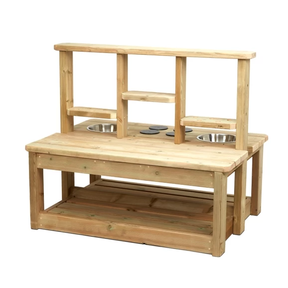 With a Mud kitchen on one side and busy bench on the other, the Millhouse Outdoor Island Kitchen is truly inviting. The functional design promotes collaborative play, while the upper and lower shelves provide plenty of storage for accessories.