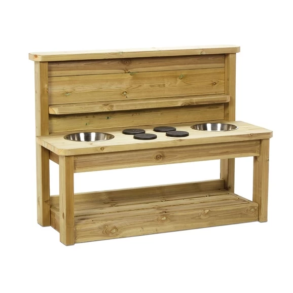 This Large Mud Kitchen comes complete with 2 x removable bowls for mixing/exploring plus 4 x hobs. This sturdy wooden unit has an upper and lower storage shelf. The upper shelf benefits from handy storage hooks, ideal for hanging pots, pans and utensils. Made using premium quality Scandinavian Redwood with a smooth finish to ensure there are no splinters and rounded edges for added safety. Freestanding, sturdy design which is delivered fully assembled. Manufactured in the UK. Specially treated timber guaranteed for 10 years.