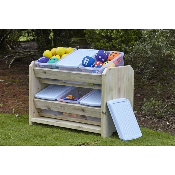 The Outdoor tilt tote storage unit comes with 6 x clear tubs which are inclined for easy access. Tubs are supplied with lids to protect resources from the elements. Made using premium quality Scandinavian Redwood the unit is sturdy and durable.