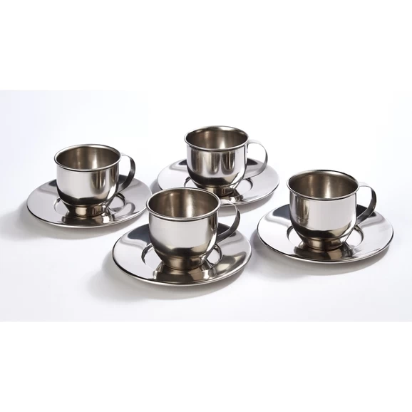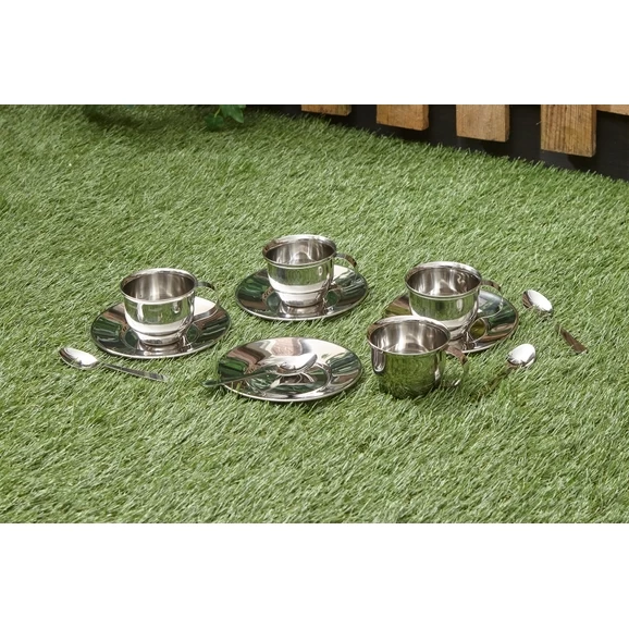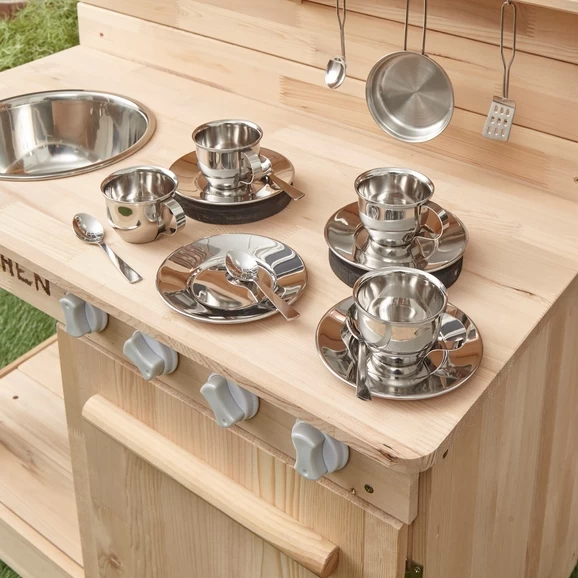 A set of four Mini Metal Cups, Saucer & Spoons. The steel material makes the set really engaging and tactile and is sure to bring excitement into the home corner or for use outdoors in the messy play area having a muddy, messy tea party.
