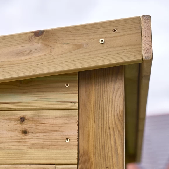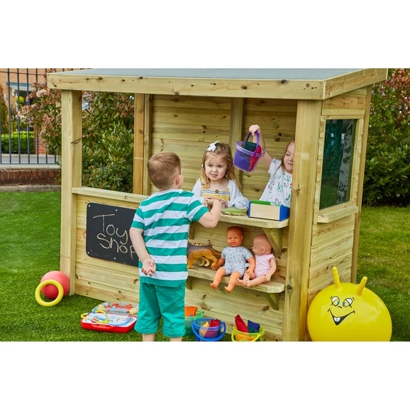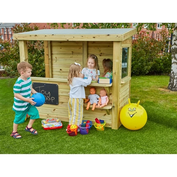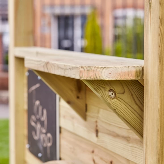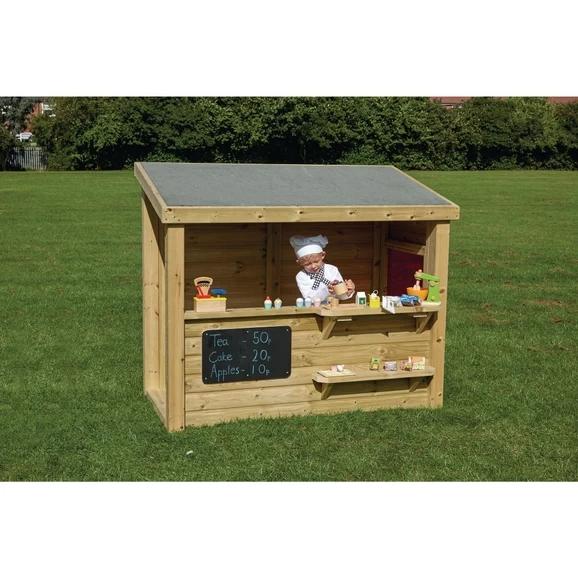 Sturdy wooden shop designed specifically for outdoor play, a perfect environment for simulating cafe and shop role play. Can be used to lead imaginary role play for one or more child