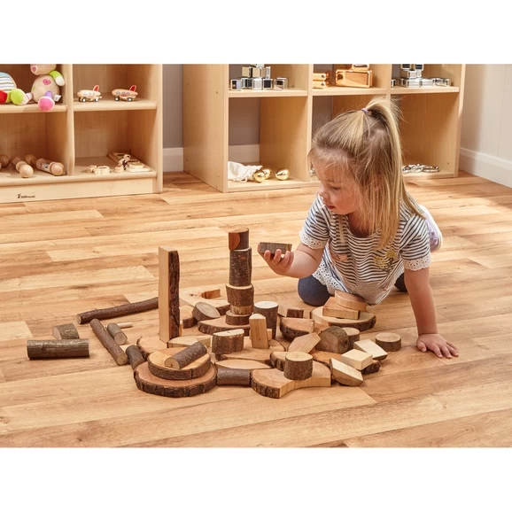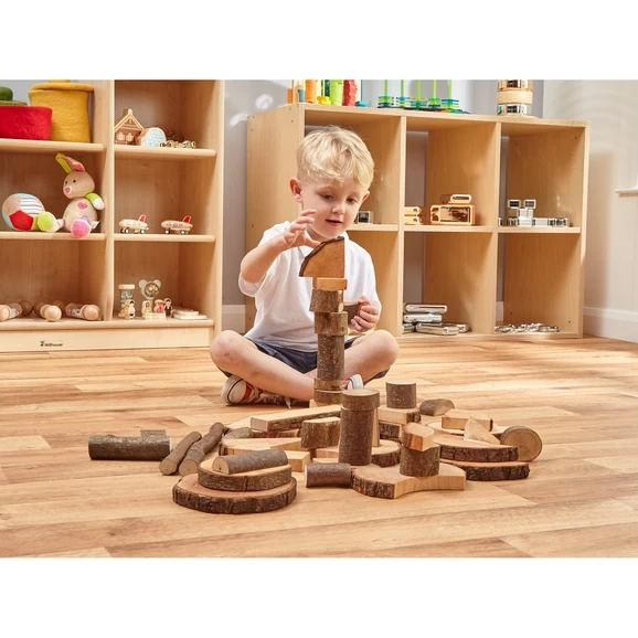 These Natural Wood Creative Blocks allow children to explore different textures as they have a bark outer. They could also be used for loose parts play, stacking, construction or transient art to create flowers, animals, vehicles or faces.