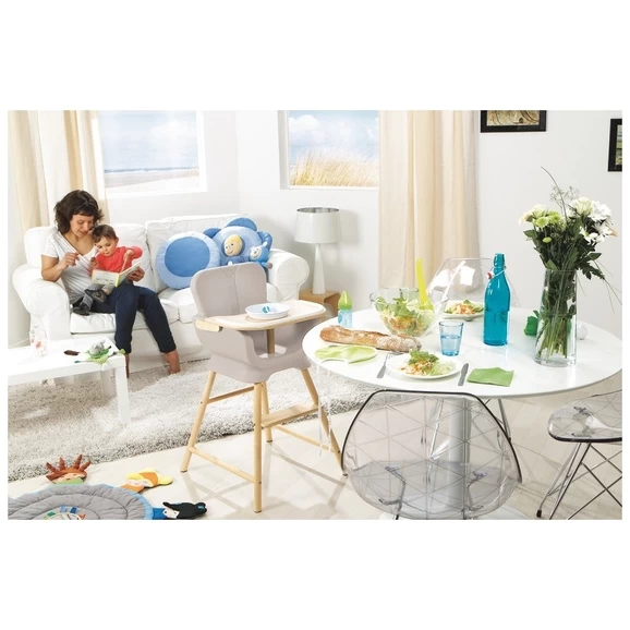The Igloo Highchair and Tray has modern wooden legs and comes in neutral colours to compliment a home-from-home environment in the nursery. It features a detachable tray, a wipe-clean seat and a 5 point safety harness.
