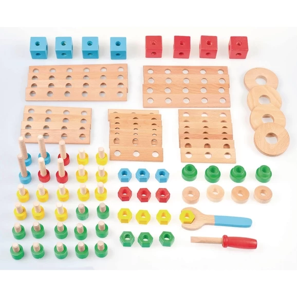 Imaginative youngsters will be able to go above and beyond with the Tidlo Construction Set. With 91 pieces, this construction kit contains tools, coloured screws, bolts, wheels, blocks and planks; all of which can be pieced together to build even the most complex creations. Build it, bolt it and tighten it! Using the screwdriver and spanner provided, budding young builders simply screw the pieces together to create a variety of imaginative constructions. What will you build? Easy to assemble and take apart, there is even a booklet included with example models to get you started. This extensive set comes supplied in a handy storage bucket. A great way to encourage creative and imaginative play sessions. Develops hand/eye coordination, fine motor skills and dexterity. Average block size 37mm