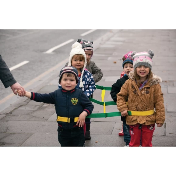 The Walkodile® Safety Web is a simple and cost effective way to keep young children safe on walks and helps manage group outings more effectively. A maximum of 6 pupils each wear an adjustable safety belt around their waist, which is connected to the Safety Web’s spine. Children can hold hands or simply walk along. Adult supervisors hold onto the children’s hands. It’s great fun for the children, and don’t worry – if 1 child falls the rest don’t all fall over!