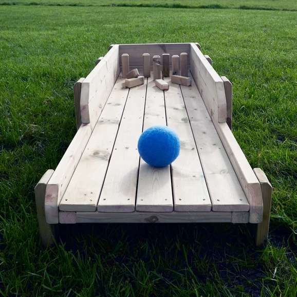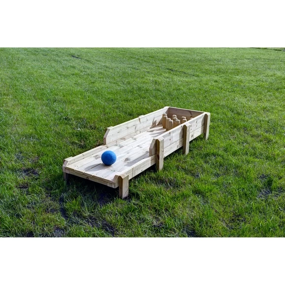 A great addition to any establishment this Outdoor Bowling Alley will provide hours of fun for everyone. Children can take turns in rolling the ball along the alley to knock down as many of the 10 skittles as they can in one go, then rack them up and go again. The timber resources are made from sustainably sourced Redwood timber that comes with a 12-month product guarantee and 10-year timber guarantee (against wood rot and insect damage). Delivered: Fully assembled. NOTE: Ball not included