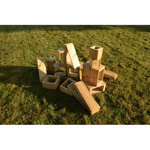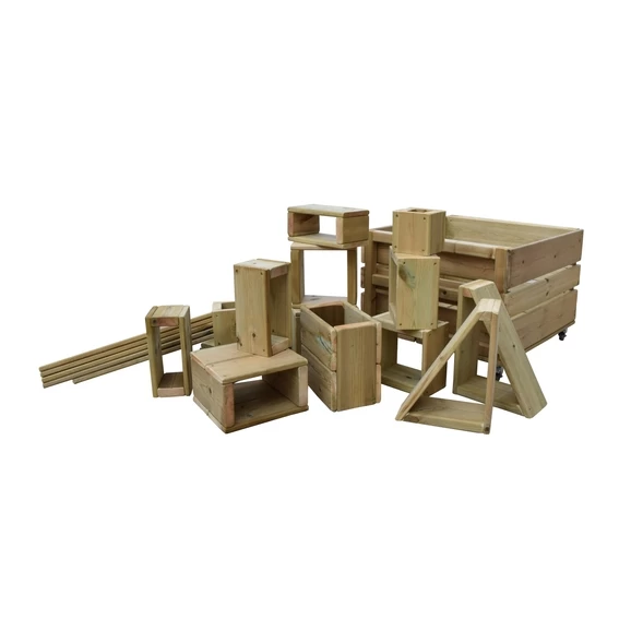 This set of Outdoor Construction Blocks from Hope Education are sturdy and specially designed for outdoor use, made from treated timber guaranteed for 10 years against wood rot and insect damage. The set includes a variety of shapes as well as flat planks to allow for open-ended play opportunities for children. All contents pack away in to a handy storage crate with castors to ensure it is easy to move.Â