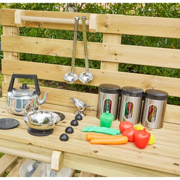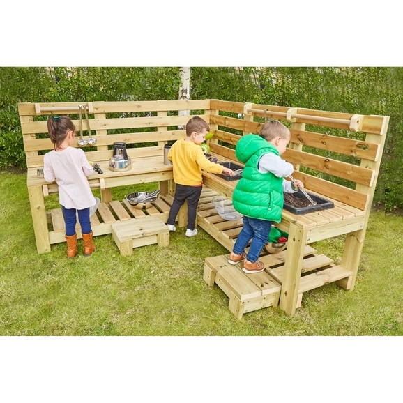 This large L Shaped Mud Kitchen ensures a large group of children can play together having fun outdoors! Features 2 plastic washing bowls, a play cooker, hanging rails and a handy storage shelf. Also included is two handy steps for smaller children to use. Made from sustainably sourced timber, treated against rot so is suitable to be left outdoors. Delivered fully assembled.