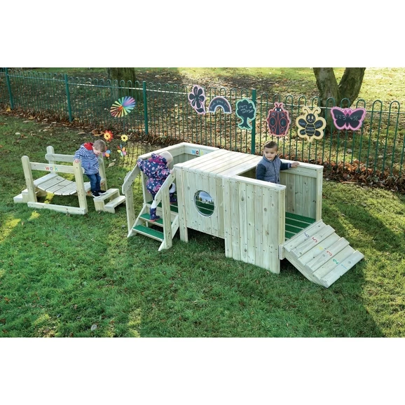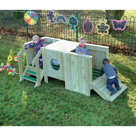 - With safety deck flooring, a wooden tunnel with a lookout bubble, a built-in mirror and mini shuffle ramp, it’s the perfect way to introduce your young ones to adventure play.