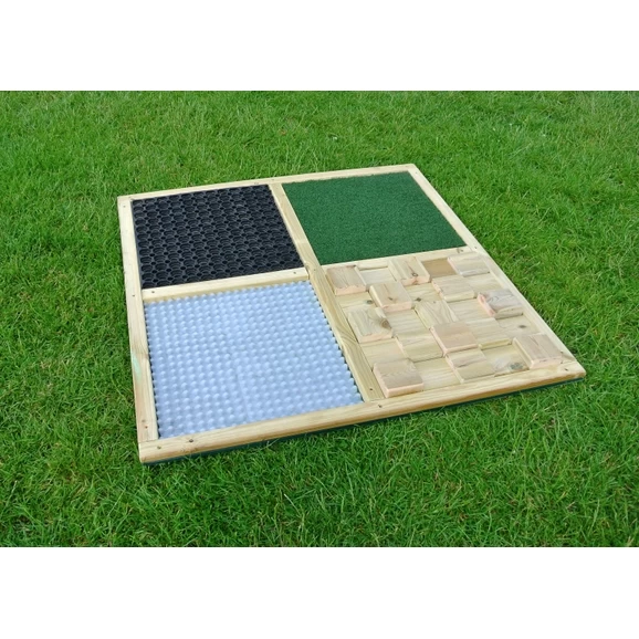 This fabulous Sensory Square, is a great addition to your outdoor space, creating a tactile and multi-sensory experience for children, on their hands and feet. The strong, durable wooden frame is made of Scandinavian Redwood from sustainable sources. The sensory square contains 4 different textures,  wood, faux grass, soft rubber and a firmer plastic bubble, that allow exploration with by children and adults alike through toes, fingers, soles and palms.. Encourages balance, hand eye co ordination as well as communication in relation to how the textures feel to touch and how they make you feel! Self Assembly.Â