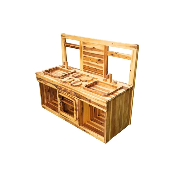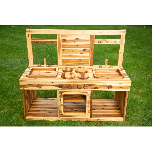 This attractive Outdoor Wooden Mud Kitchen perfect for engaging young children in imaginative play. It can help to promote cooperative play and develops children’s imagination and social skills. Features two sinks, two taps an oven and hob plus two storage compartments whilst the high backboard can be used for hanging kitchen utensils. The sinks can easily be removed for cleaning after messy play.