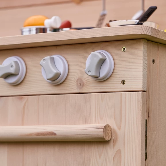 Mud kitchens make a perfect addition to any outdoor space, encouraging interactive group play and developing a wide range of skills! As well as using fine motor skills for all the pouring and mixing, children can build new vocabulary, explore the properties of items found in the world around them and even incorporate numeracy by creating their very own recipes. This Outdoor Wooden Mud Kitchen is ideal for little ones to cook up some mud pies and have hours of fun! The door on the front opens for accessory storage and the set includes 2 hobs, 1 sink, 4 clicking dials and a set of 6 stainless steel accessories and metal hangers. The mud kitchen is treated with a clear non toxic wooden preservative, however we recommend that the wood is retreated every 6 months when left outside with a clear non-toxic or natural oil based wood preservative. Simple self assembly required.