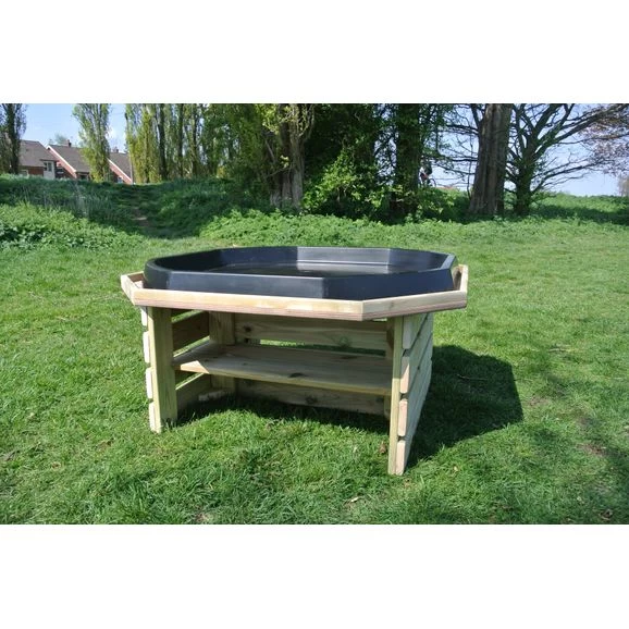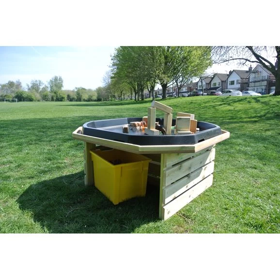 This fabulous wooden outdoor stand is designed to fit our play tray perfectly. With its rounded shape it creates the perfect outdoor space for collaborative play. There are also wonderful deep shelf for storage too. The top can also be used as a play area without the tray.