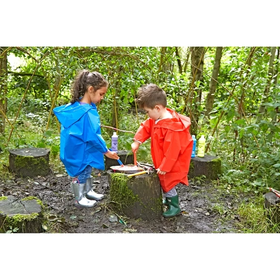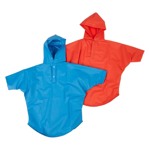 A waterproof hooded cape made in EVA material with hook and loop fastenings.