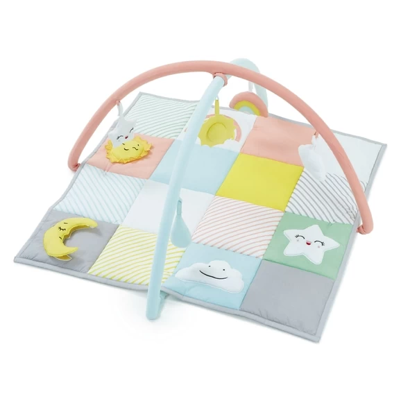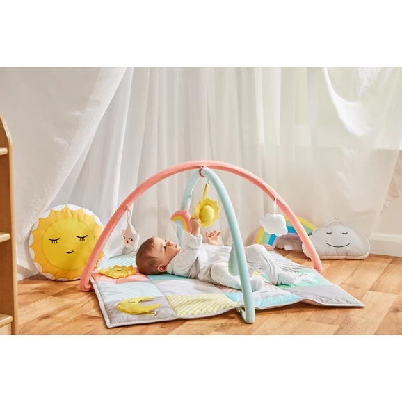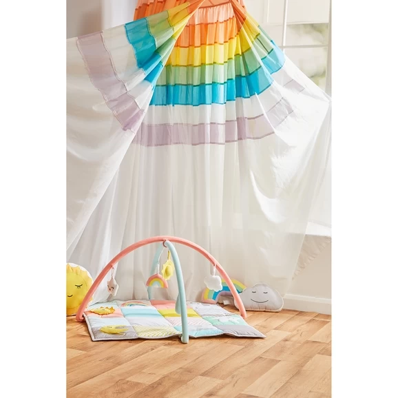 The Rainbow Baby Gym is decorated with a variety of sense stimulating appliques. Baby can explore a squeaking sun and cloud, crinkly fabric star and a baby-safe mirror moon, helping to promote self-awareness. Also features five removable rattles.