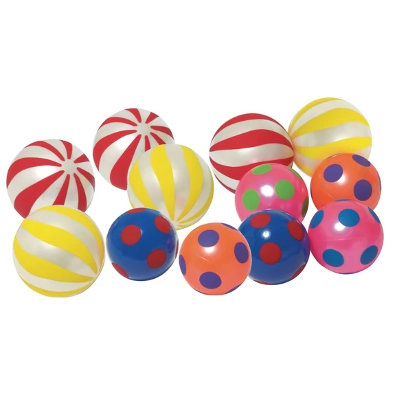 Set of 12 brightly coloured balls ideal for small hands. The brightly coloured Spots and Stripes Balls can be used for a number of different games and activities. ;