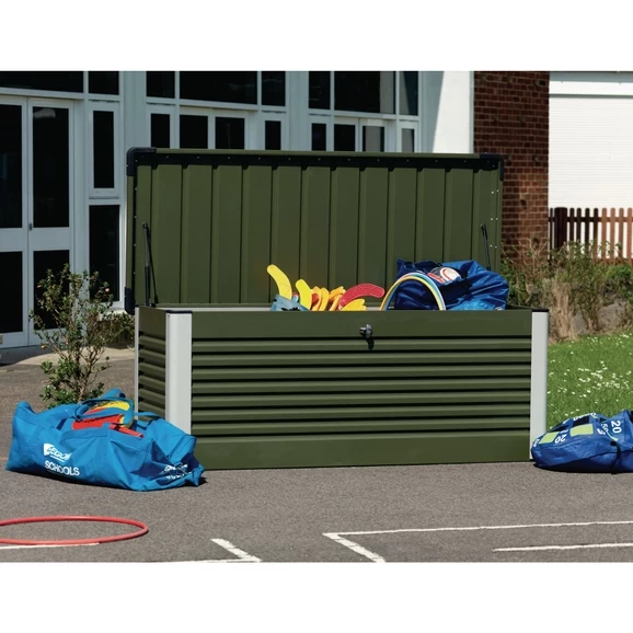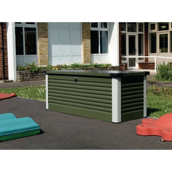 This Trimatals storage box is a superior quality patio box which features attractive modern design in a range of vibrant colours. It is a top opening storage unit, with stainless steel fixings, a gas strut assisted hinged lid and a double-bolted key lock for added security. The product is designed to be bolted down onto a hard base and comes complete with a heavy duty integral metal floor. A compact and functional storage solution which is ideal for playgrounds and storing play equipment.