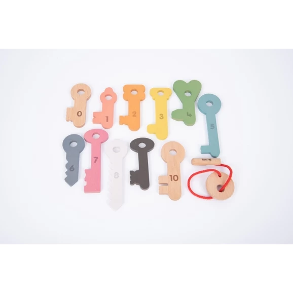 The TickiT Rainbow Keys are chunky beechwood keys, all featuring different projections which are numbered from 0 to 10 on one side with corresponding numicon dots on the reverse.