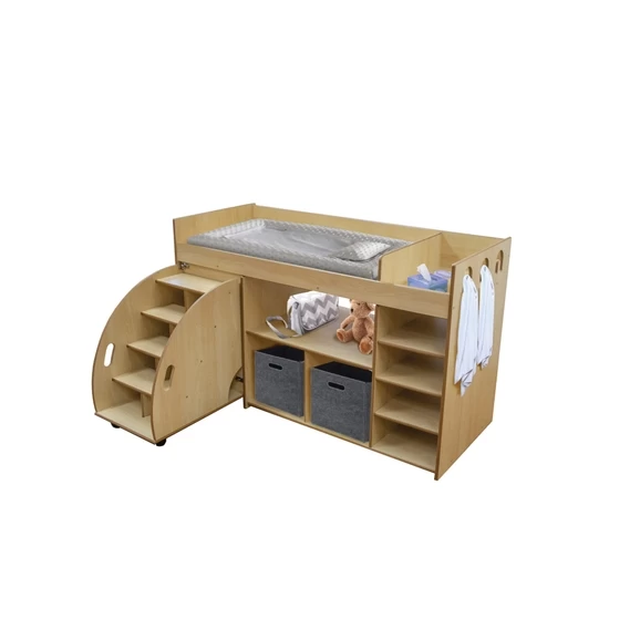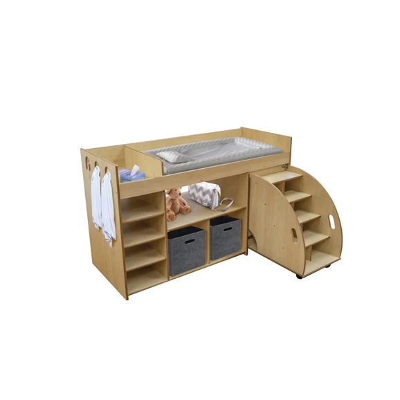 The Wooden Baby Changing Station with Steps features abundant storage for nappies and wipes. The easy-climb steps are on castors which are easily pulled out and feature a locking mechanism so they lock into place when in use. When not in use, the steps easily glide back into place under the unit for storage. The raised changing surface provides a safer working height for carers eliminating the need to lift and bend quite so often.