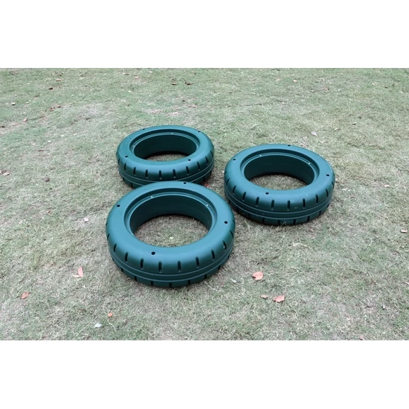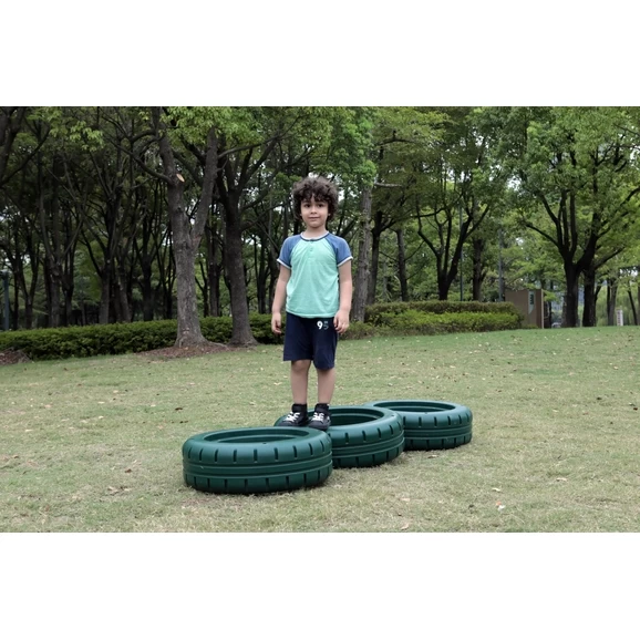The tyres can be combined and used as platforms for jumping, crawling, climbing, tossing, and balancing.